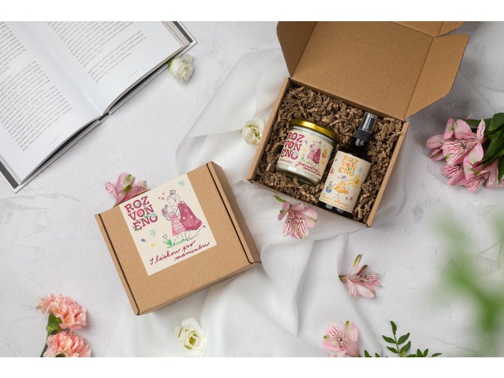 Dárkové balení S láskou pro maminku obsahuje přírodní svíčku a osvěžovač vzduchu. Hodí se jako dárek ke Dni matek, ale i k jakékoli jiné přiležitosti.